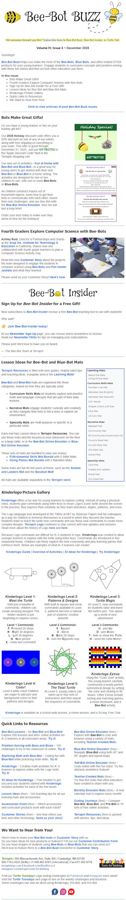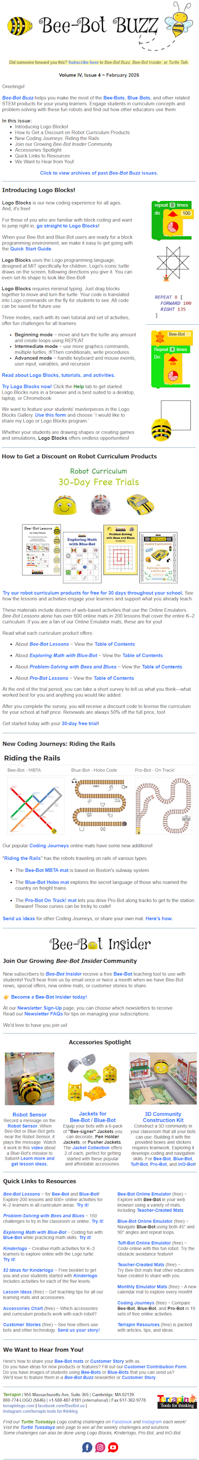 All embedded links in Bee-Bot Buzz worked at time of publication. If you run across a link in an older issue that no longer functions, try searching for the topic or use this form to send the link to Terrapin and we will try and update it for you.