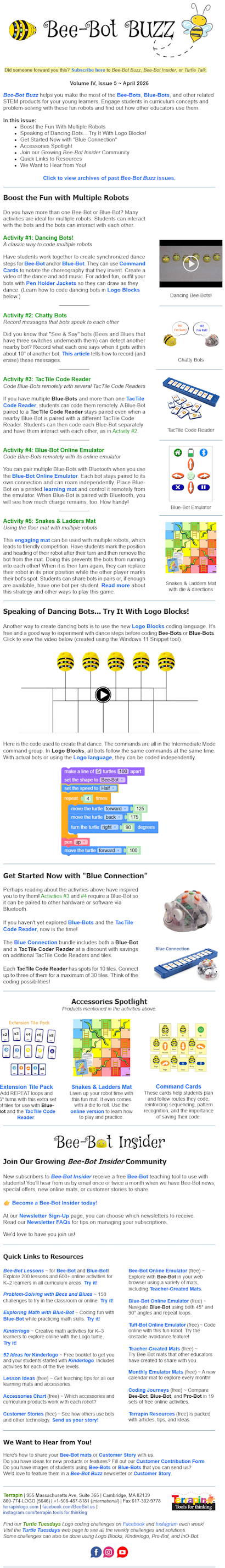 All embedded links in Bee-Bot Buzz worked at time of publication. If you run across a link in an older issue that no longer functions, try searching for the topic or use this form to send the link to Terrapin and we will try and update it for you.