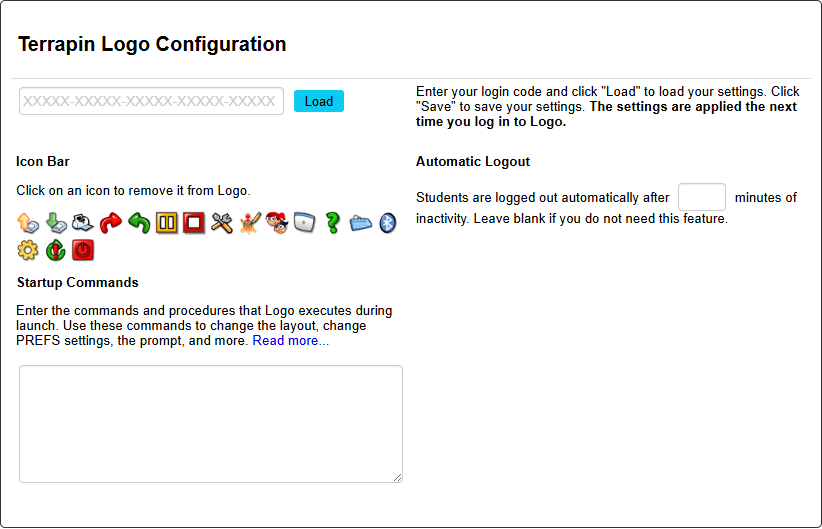 To access these startup features, go to https://logo6.terrapinlogo.com/config. Enter your license number at the top. Then click the Load button to see what options have been configured, if any.