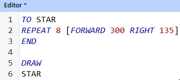 Keystroke Commands: Logo offers many keyboard shortcuts, which you may wish to learn. For example, the function key F11 sets Logo to take up the full browser tab. This is called Fullscreen mode, not to be confused with Logo’s FULLSCREEN command. To return to the normal layout, press F11 again, or press and hold the |