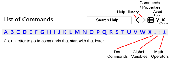 | Help: Help information is now fully integrated into Logo! You can search for a command you want to learn more about or browse through them. If you want to know more about a command that is in your Editor panel, just double-click it and you can choose see the Help for that command. You can even use Shift+arrow key to go through all the commands in alphabetical order, one by one. The arrow keys at the top of Help let you return to previous commands you have looked at. Click the Menu button to switch between Commands and Properties. There are also Dot Commands, Global Variables, and Math Operators to explore! |