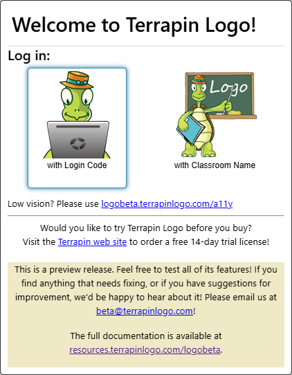 As a beta tester, you will see this dialog box when you first launch Logo: