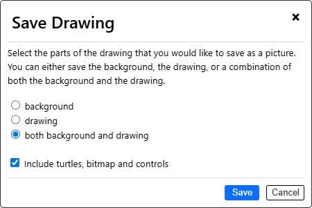 Picture (.png) Saves the Graphics panel as a graphic image in a .png format. The picture can be saved with or without the background, or with or without any turtles or bitmaps.