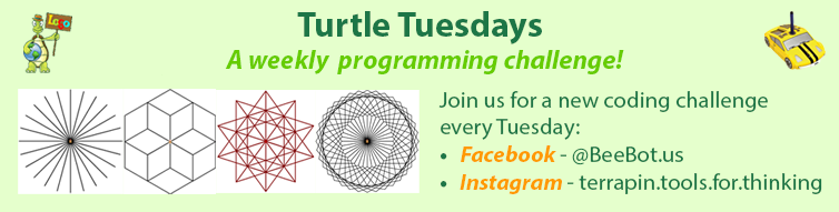Turtle Tuesdays offers fun programming challenges for Logo and (sometimes) Pro-Bot, InO-Bot, and Kinderlogo users. All the challenges are archived, with links and solutions in the sidebar. Some challenges are easy for beginning Logo coders to try, others are more difficult. All students will enjoy creating code that makes their project special to them as they explore new commands. Encourage your young coders to work collaboratively on projects.