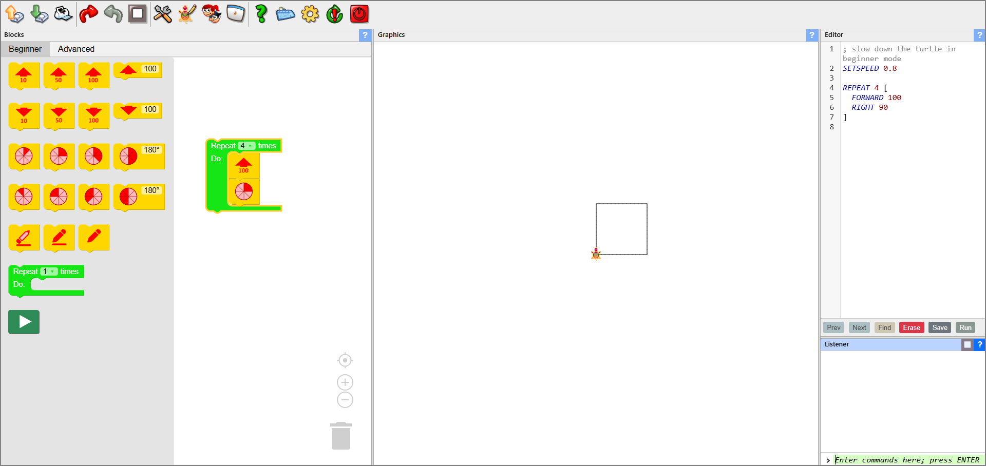 Logo Blocks has three modes, Beginner, Intermediate and Advanced. Initially, the Beginner mode is displayed, with small blocks to move the turtle around and work with basic Logo commands.