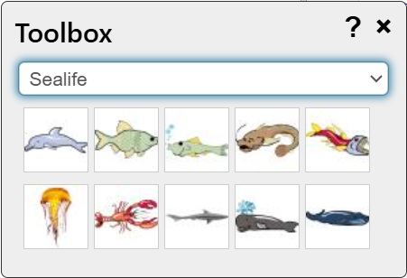 Open the Toolbox and then select the Sealife panel and drag a whale out to the Graphics panel. Once it drops, Logo tells you the name of the bitmap, like for example WHALE1.PNG. Now, you can maniuplate the heading, the size, and much more in two ways. You either use PPROP or PPROPS to change the whale’s properties, or you use the command TELL "WHALE1.PNG to talk to the whale instead of the turtle. Then, you can work with the whale as if it were a turtle.