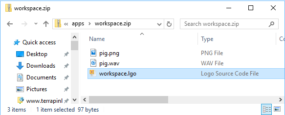 Since the PC file system has limited functionality, Logo offers you a separate in-memory file system where you can manage your files as you would like. You can use all file commands on that file system; the file system does NOT save its contents to disk, however; you need to use the SAVE contents of the storage to disk, and you must supply a file name ending in .ZIP or .LOGOENV so Logo know that you want to save the FILES file system. Such a Zip file is a compressed archive of files and folders, and can,