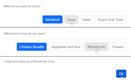 IF :SELECTION = "|Soup| THEN MAKE "SOUPCHOICE (ALERT [|What kind of soup do you want?|] "|Chicken Noodle| "|Vegetable and Rice| "|Minestrone| "|Tomato|) (ALERT (SENTENCE "|I hope you enjoy your| :SOUPCHOICE WORD :SELECTION ".))