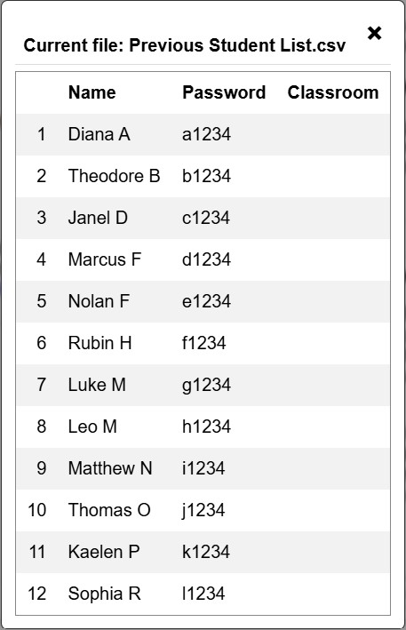 If you want more fine-grained control over who logs in to Logo, you can upload a CSV file containing student names, passwords, and classroom names.