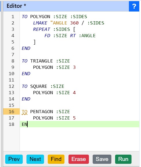The Editor displays lines with errors in them with the line number background set to red, and warnings with the line number background set to orange. As usual, double-click any error and wait for Logo to display a hint. Actually, you can highlight any command at any time to see a short explanation of the command!