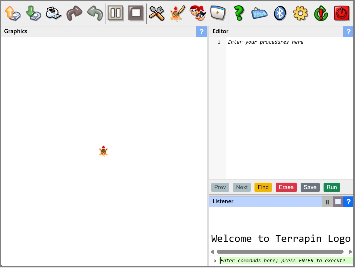 Often, some of these icons are grayed out, which means that the icon is not available at this moment. For example, the Undo and Redo icons are grayed out initially because the turtle has not drawn anything yet, so there is no drawing to be undone or redone.