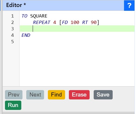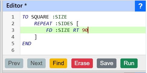 Type TO SQUARE to bring up the workspace editor again. Click right behind the word “SQUARE”, and enter the name of the input. Since we are going to draw squares of any size we want, let’s use the name SIZE for our input to SQUARE. Type :SIZE and then click into line 2. Replace the 100 input to FD with :SIZE. When you run SQUARE later on, :SIZE will be automatically replaced with the actual input you give to SQUARE. Click the Run button to save your new SQUARE.