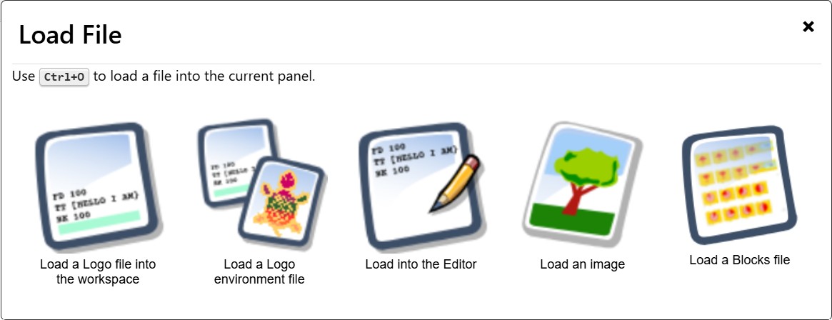 Loads the total environment for that file: everything in the Listener panel, Editor panel, Graphics panel, and any procedures created. This is the best choice for students who are working on a project or new to Logo.
