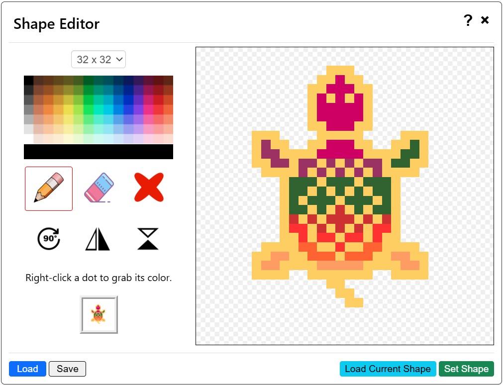 This loads the shape of the first active turtle into the shape editor. Again, the shape editor selects the size depending on the size of the shape, and shapes larger than 64 pixels are scaled down accordingly.