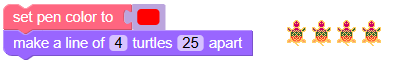 So, set the pencolor after using the make a line or make a circle block, not before. Now it will work! This applies to all commands you want all the turtles to follow.