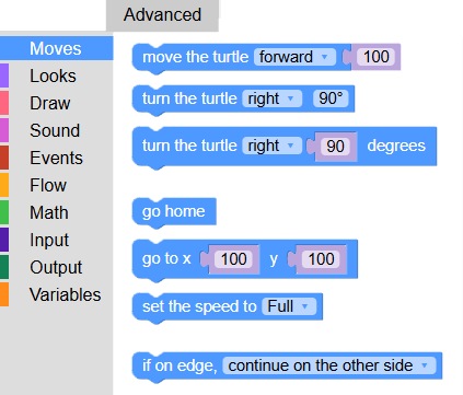 Logo Blocks starts out in Beginner mode. Click the Advanced tab for dozens more block commands.