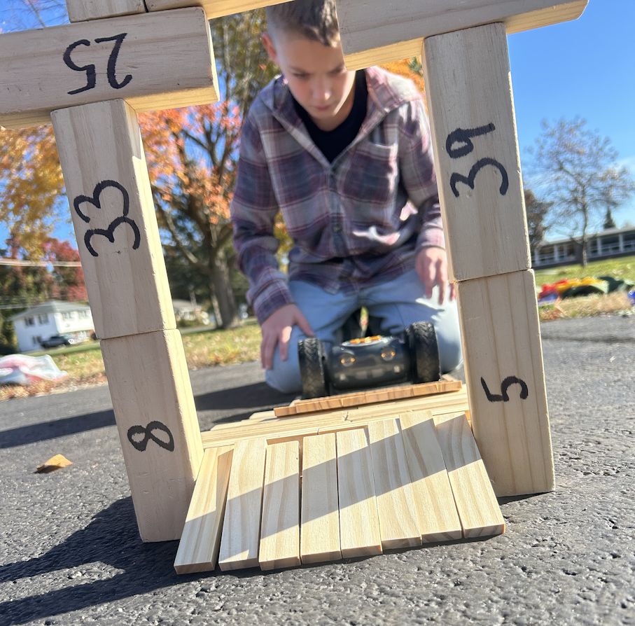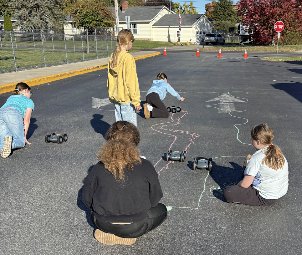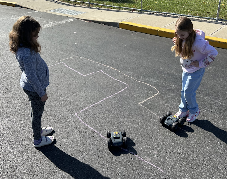 Students love creating paths with chalk and seeing if they can code the robot to follow their lines. They also love to use Keva Planks and our Jenga set to build ramps and tunnels. Through careful calculations and many iterations, students learn to break down complex problems.