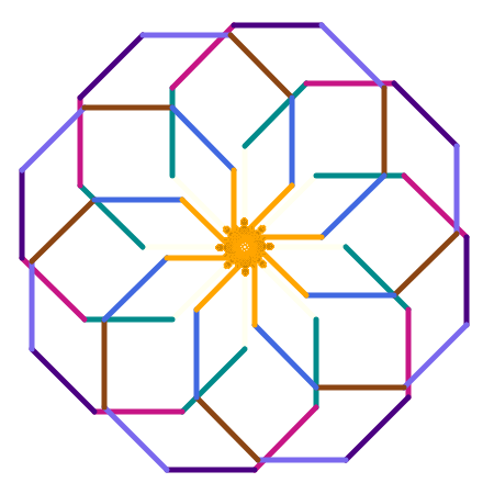 This design uses multiple turtles to draw a repeated pattern using random colors.